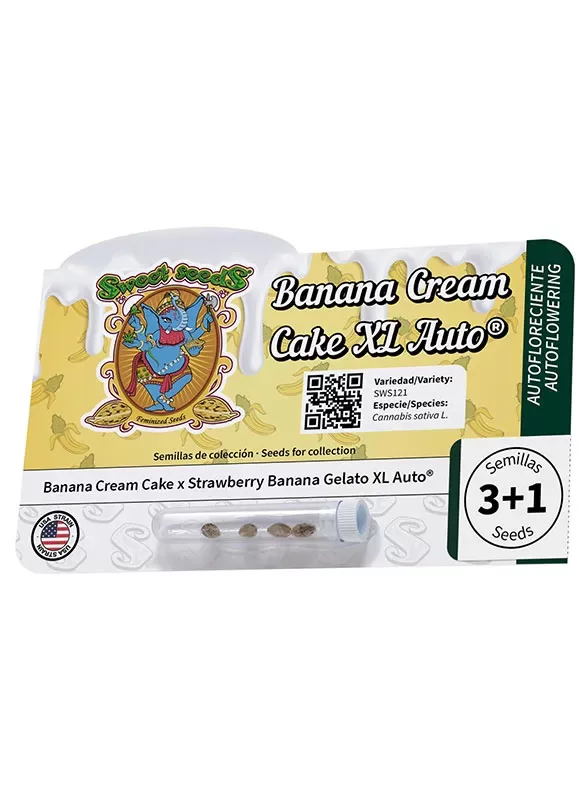 Banana Cream Cake XL Auto® di Sweet Seeds è un’autofiorente XL di 7ª generazione nata dall’incrocio tra Banana Cream Cake e Strawberry Banana Gelato XL Auto®. È una varietà pensata per chi cerca fiori grossi, compatti e molto resinati, con un profilo aromatico dolce e fruttato davvero moderno.