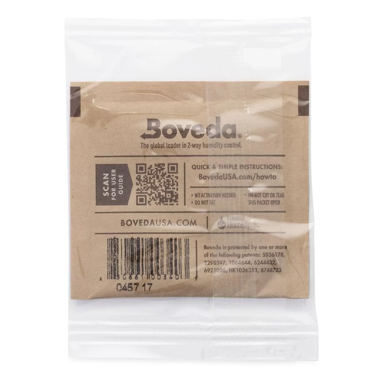 Le confezioni brevettate di Boveda, inserite nei contenitori, mantengono l’umidità relativa stabile e aggiungono o assorbono umidità per mantenere il contenuto al 62% (+/- 1%).