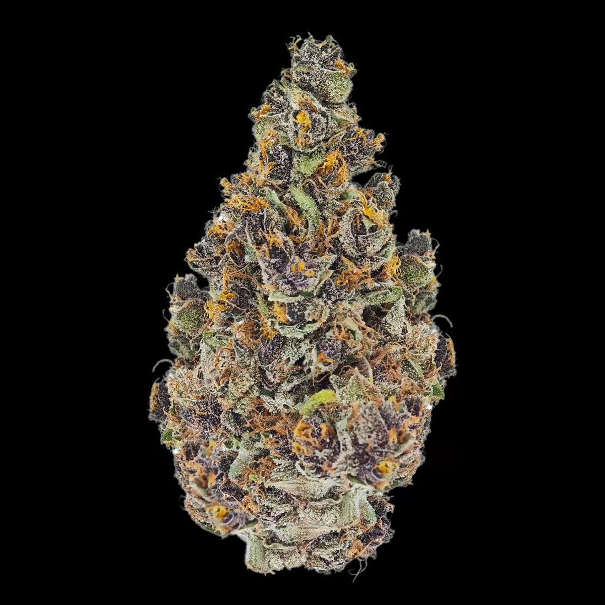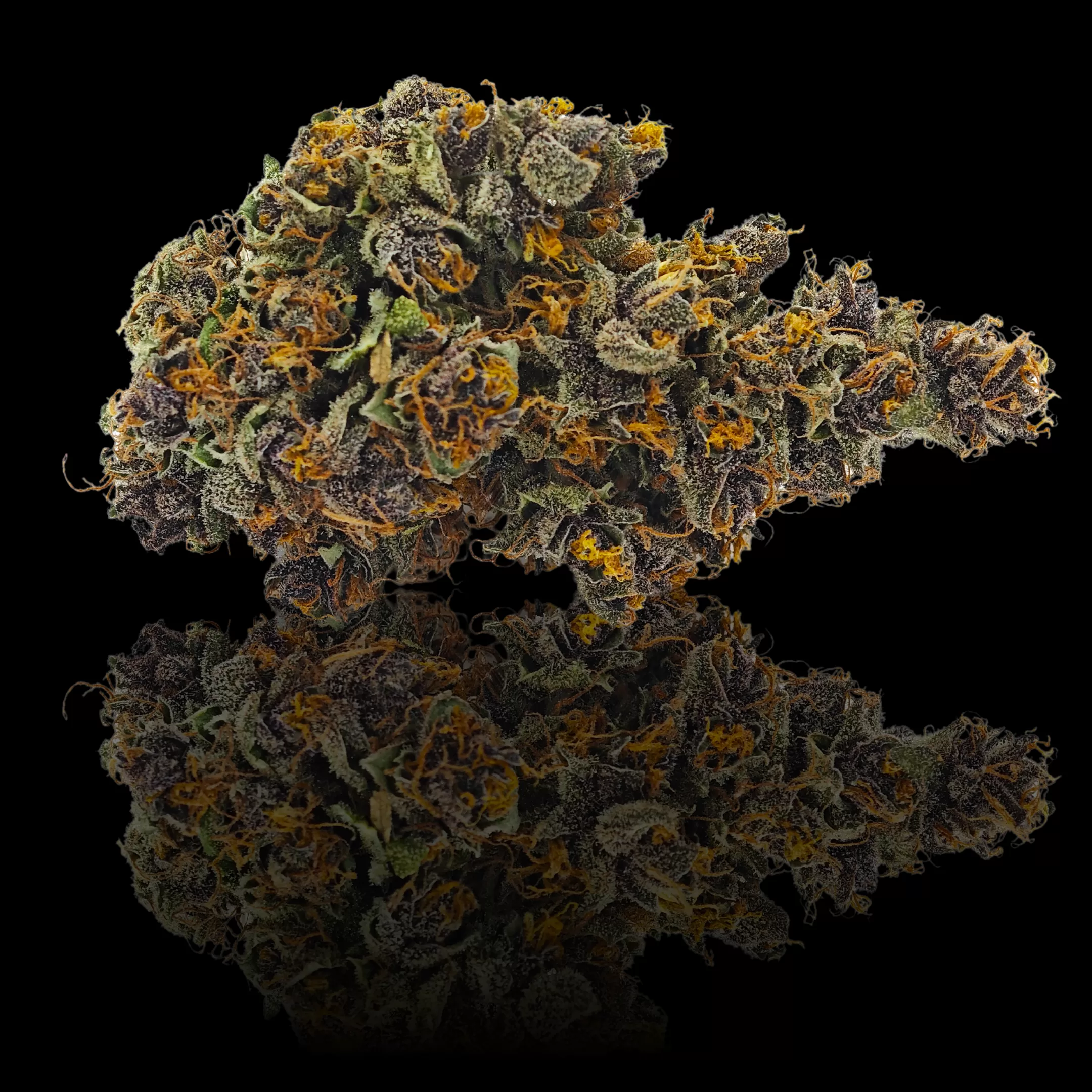 La superficie delle infiorescenze è completamente ricoperta da tricomi resinosi e scintillanti, che conferiscono un aspetto lucido e quasi ipnotico. Questa ricchezza di resina non solo garantisce un alto contenuto di cannabinoidi, ma è anche un segno tangibile della qualità elevata di questa varietà.
