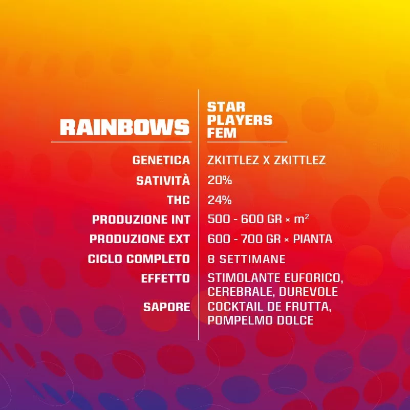 Questa varietà ha una struttura molto bassa, di aspetto indico e risponde molto bene alla potatura, con una piccola distanza internodale, ma con elevate esigenze nutrizionali per realizzare il suo pieno potenziale. È importante prestare attenzione a questa varietà se è piantata indoor, perché le Rainbows possono raddoppiare .le loro dimensioni, generando produzioni molto generose.