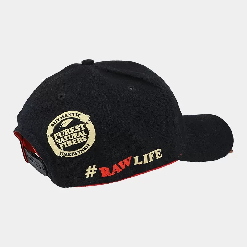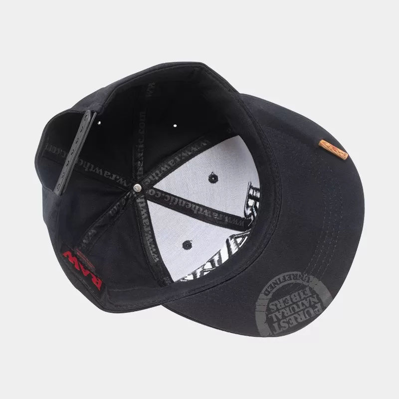 Questo cappello snapback nero presenta un logo RAW sfalsato ricamato sul pannello frontale e testo lungo la parte superiore della visiera arrotondata.
